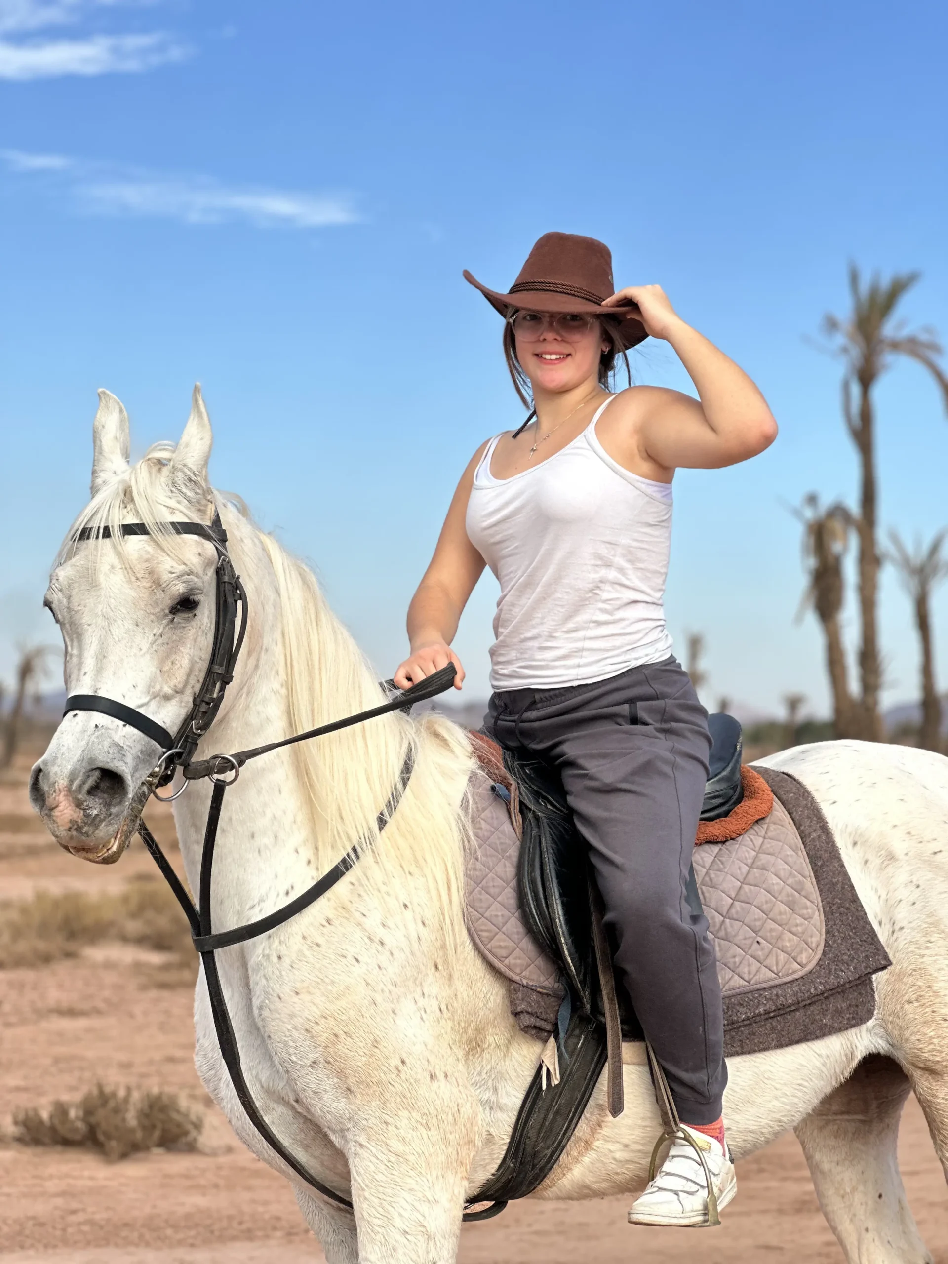 Partez à l'aventure avec nos chevaux experts lors d'une randonnée équestre a la palmeraie du marrakech. Découvrez des panoramas époustouflants, traversez des ruisseaux et admirez la beauté sauvage des sommets en explorant des sentiers de palmeraie passionnants.